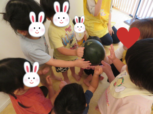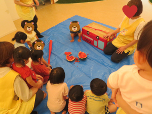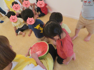 先生が魔法をかけてくれると(笑)、うさぎぐみのおともだちの協力でスイカが割れて、みんな大喜び!🤩