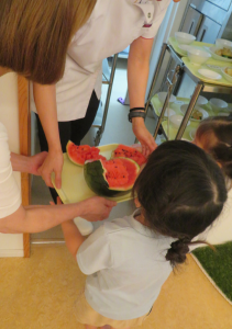 先生が割る前の丸いスイカと、半分に切ったスイカを見せてくれました🎵