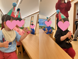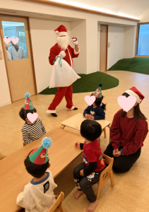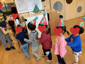 子ども達も先生もクリスマスの帽子をかぶり、保育室は楽しいクリスマスの雰囲気に包まれていました🎄