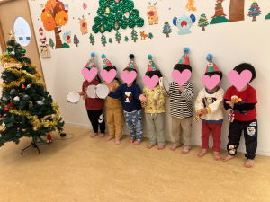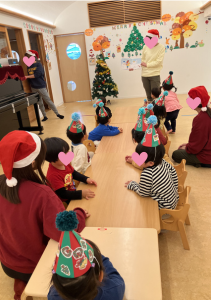 子ども達も先生もクリスマスの帽子をかぶり、保育室は楽しいクリスマスの雰囲気に包まれていました🎄