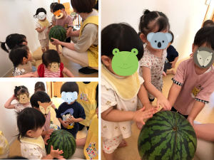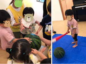 こんにちは!ビジョンキッズ保育園です! 8月に園でスイカ割りを実施しました🍉 子どもたちは大きなスイカの登場にとても興味津々で触ったり、においを嗅いだりしていました。 うさぎ組のおともだちから順番にスイカ割りに挑戦!なかなか割れないスイカ… 最後は先生が一振りでパカッと二つに割れたスイカを見て喜ぶおともだちや びっくりするおともだち👦👧とてもいい経験ができたと思います(^^♪ スイカはみんなでおやつに美味しくいただきました。 シェアする